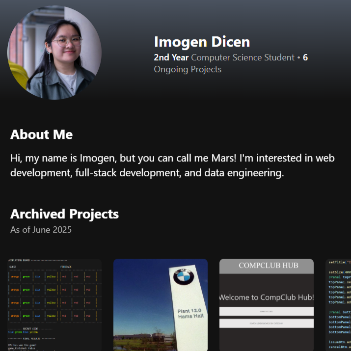 Hi, my name is Imogen, but you can call me Mars! I'm interested in web development, full-stack development, and data engineering.