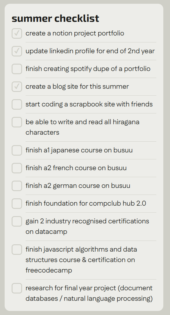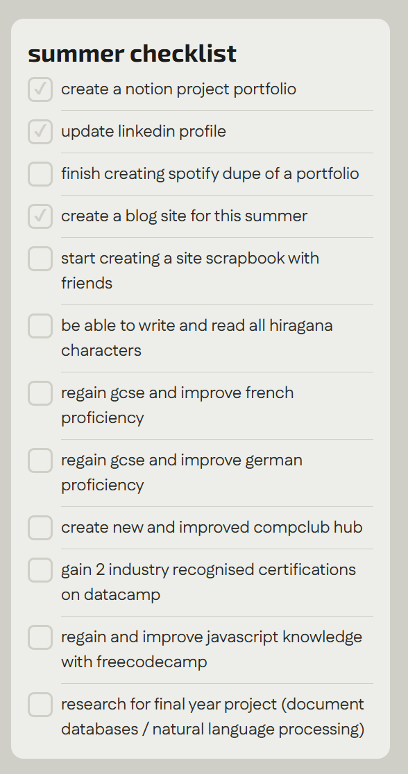 last night i realised that the summer to do list on this blog isn't fully measurable, so changed it so it will be - finished updating it at 12.39: