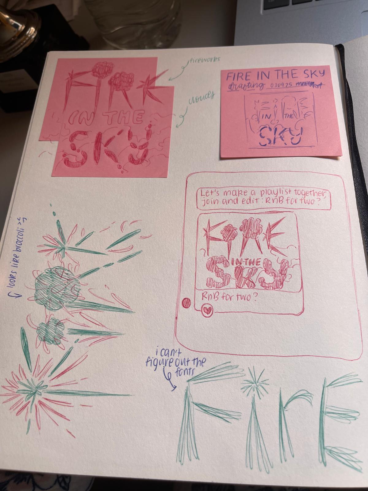 did a whole sketchbook page trying to draft what i want the logo for fire in the sky to look like
